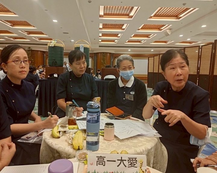 清晨返回校園,親子相見歡時間終於到囉!高中部活動地點在天文館,大家齊聚一堂,經過巧思安排,孩子們坐台下,爸媽們上台表演手語,讓孩子們找到對應的班級爸媽。本班指定手語是「365天天靜思語」,在爸媽們上台表演前,部分媽媽臨時被指派到其他地方表演手語。在人手不足情況下,爸媽們靈機一動即興表演,與踩排的內容完全不一樣,但大愛班學生代表~~訡芸仍然跑來台前跟我們相認,讓爸媽們好感動,「醬厲害!一眼就被看出來。」接著,班級孩子們分成3個家族,由3~4位慈懿爸媽協助孩子完成圓桌上的五指圖製作。藉由五指圖可讓爸媽們更瞭解每位孩子的家庭狀況、興趣、未來生活志向等。透過短暫相見歡時間,爸媽們也能進一步與孩子接觸,彼此之間有多一層的認識。