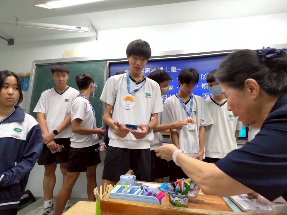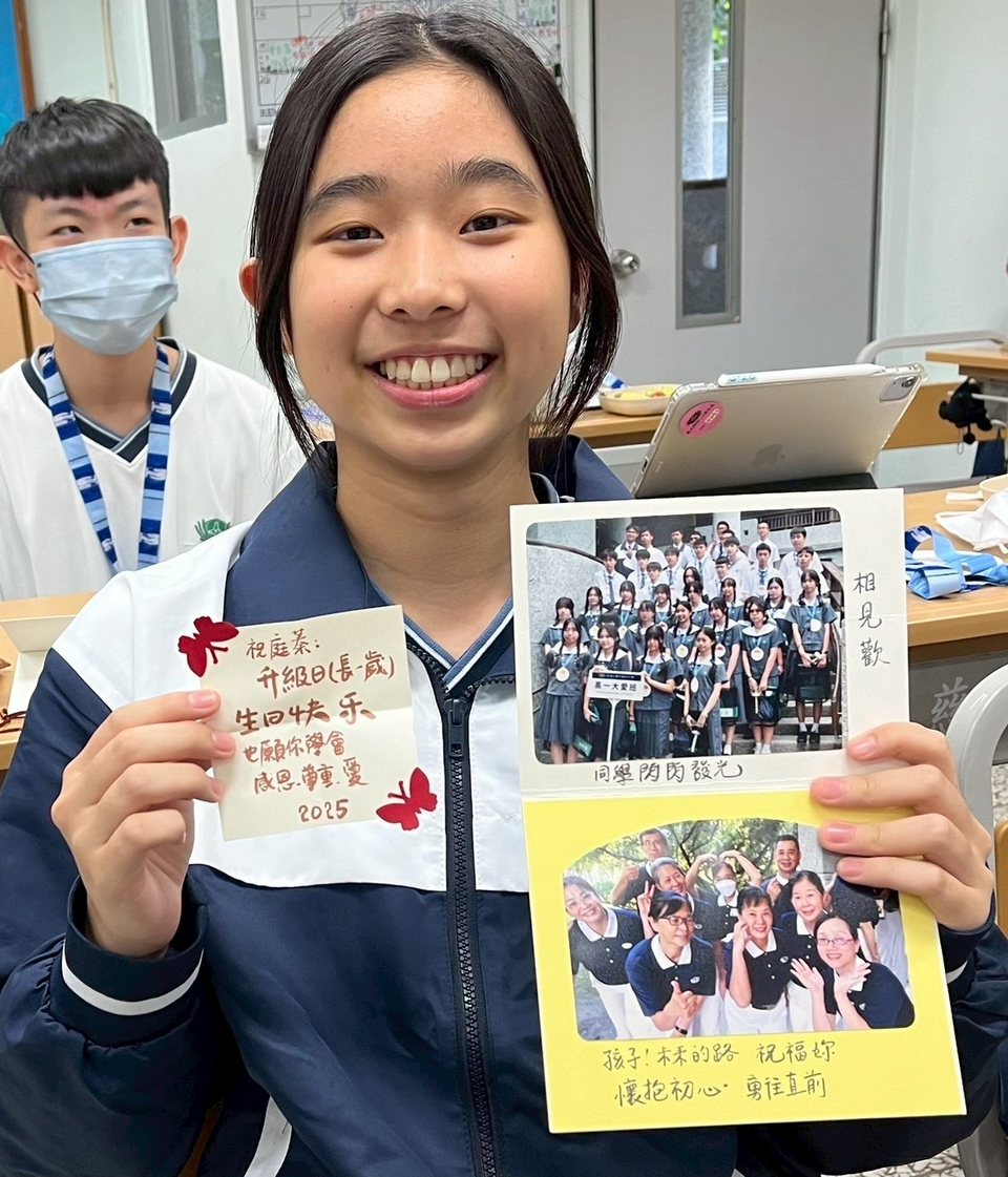 首先發給每位同學由㦤德爸媽們特別製作的立體卡片,裏面貼有大愛班同學的團體照,以及㦤德爸媽的團體照,再加上同學的個人獨照。一位女同學接到照片後驚訝地表示:爸媽也太...(無法形容),就是嫌棄自己照片太醜了,想必這年齡層的青少年很重視自己的外表,還問可不可以貼上自己漂亮的照片。