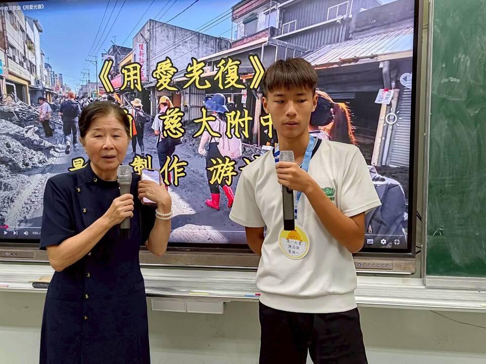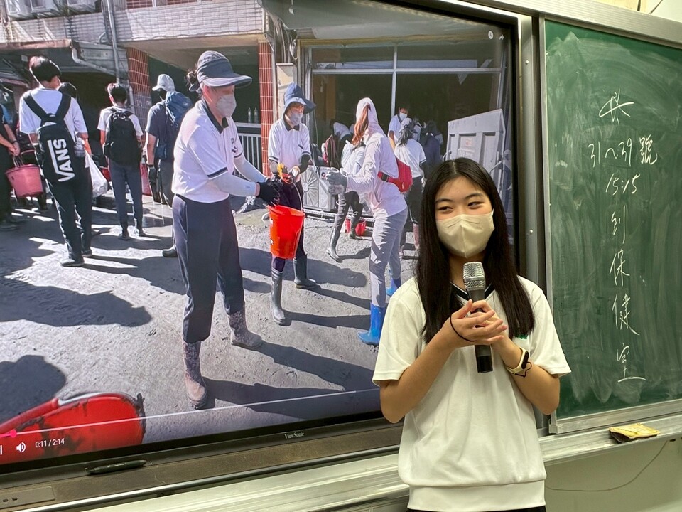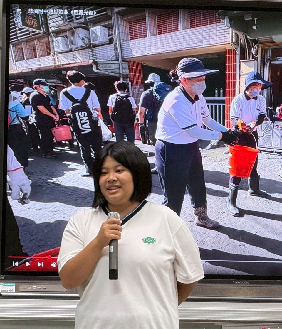 接下來由素貞媽分享本月主題:「鏟子超人」,主要介紹9月樺加沙颱風帶來的豪大雨,造成花蓮縣馬太鞍溪上游一處巨大堰塞湖潰堤,數千萬噸洪水夾雜土石傾洩而下,造成嚴重災情。不僅沖毀臺九線上的馬太鞍溪橋,更導致下游的光復鄉、萬榮鄉等多個鄉鎮遭洪水淹沒,造成10多人罹難及嚴重災損。素貞媽利用影片說明天災的破壞力,也播放全省鏟子超人前往光復鄉打掃的感動畫面。其中一段是慈中師生利用教師節連假前往光復鄉打掃的影片,看到老師及同學們不畏艱難,賣力為受災戶清掃,行善不落人後的精神,令人讚嘆。