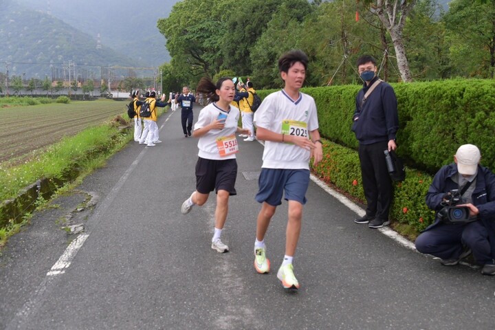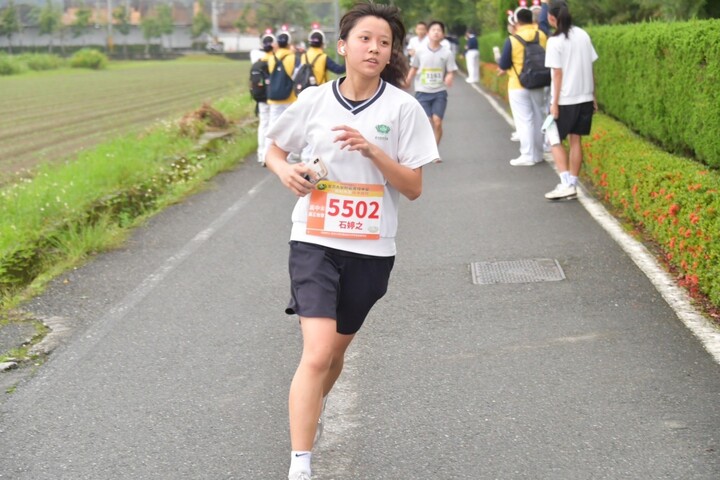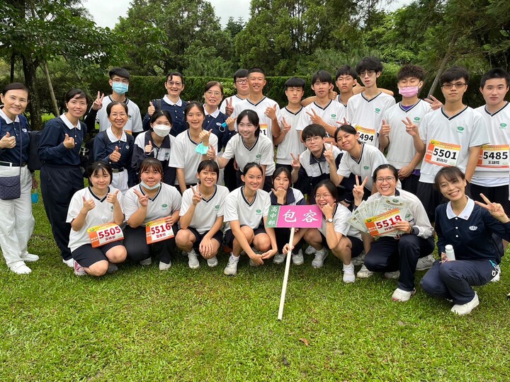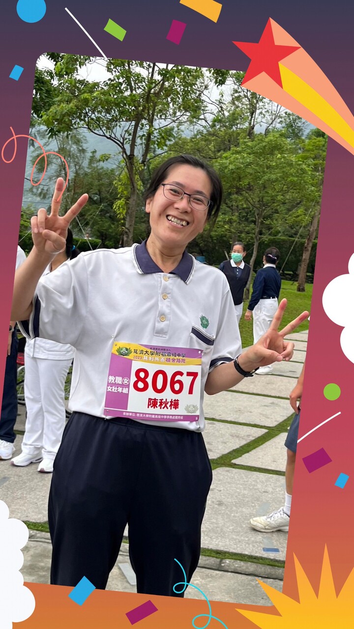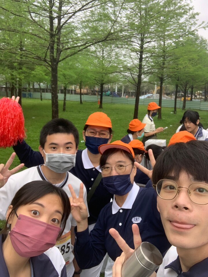 第二天的精舍路跑,高三包容班媽媽們𠄘擔了第二站啦啦隊,芳妃媽將ㄧ年前已準備好的小丸子制服、帽子及小書包穿戴起來,讓氣氛回到童年。