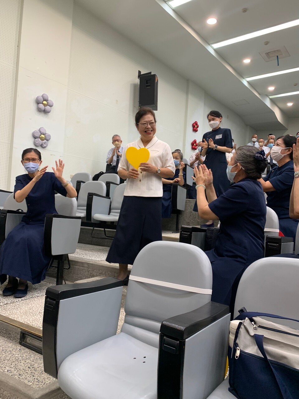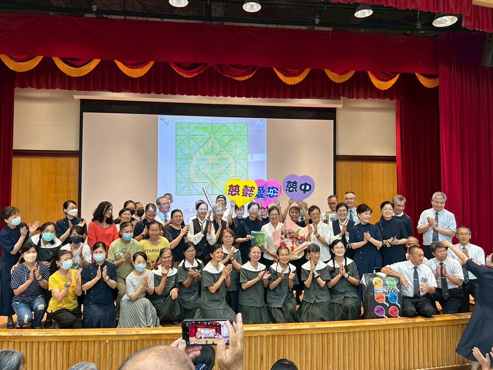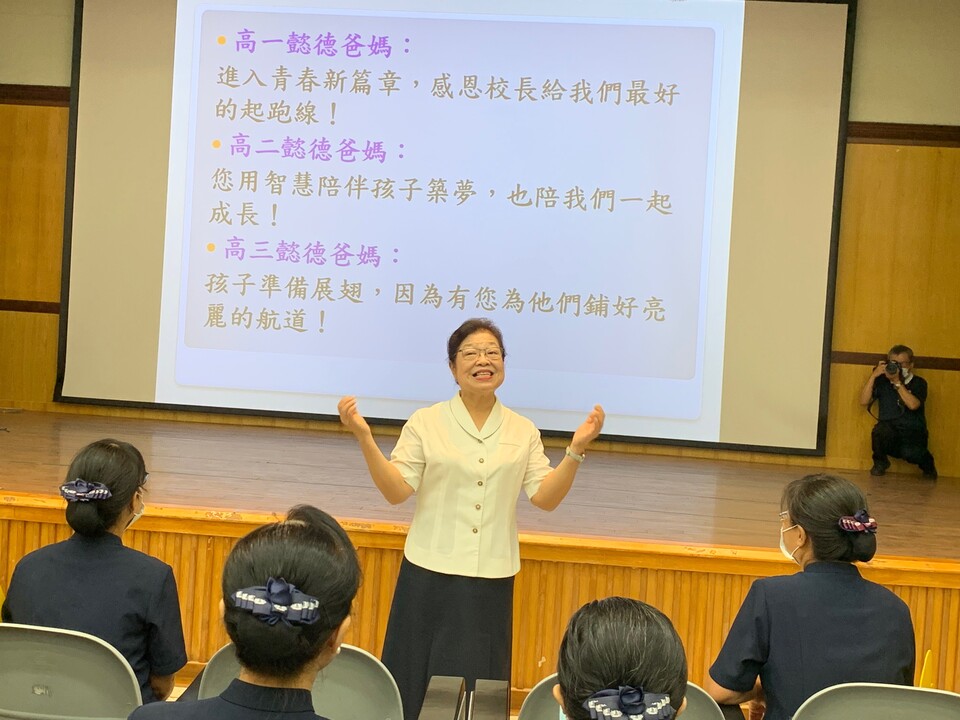 玲惠校長將學校制服換為慈濟制服,回憶著當年穿著八正道,述說著由上人手上接任校長一職的心路歷程,也感恩她家師兄的護持。而慈中為慈濟創辦的第一所學校,上人對此寄予厚望,而自身也許下宏願,以校為家,深耕學校,把學生擺在第一位,一定要把上人的起家厝(慈中)顧好,一定要讓學生越來越多,甚至要把上人的弟子找回來,一個也不能少。故勉勵所有懿德爸媽不管遇到任何困境,要逆風而行,要有正知、正覺、正思惟,法脈顧緊,做上人想做的事、愛上人愛的人,那一念心永不放棄,心堅定才能成就一大事因緣。不管將來是那位校長,咱們一起來陪新校長,成為不請之師,生生世世繼續守住慈中、守護孩子。