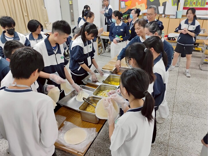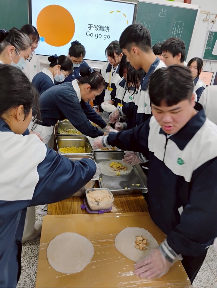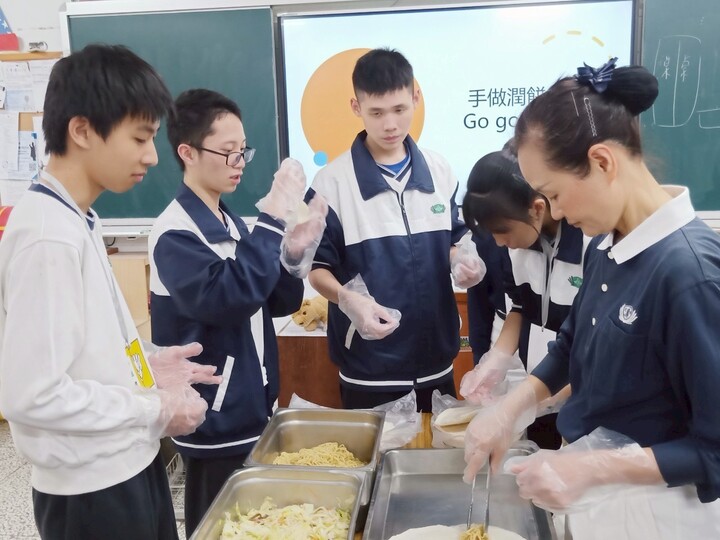 慶生之後,接著進行推廣蔬食--DIY包潤餅,請妙膳廳備料,有高麗菜、豆干、炒蛋、麵條、花生粉,孩子們覺得自己手作包潤餅很有趣,也吃得很開心。