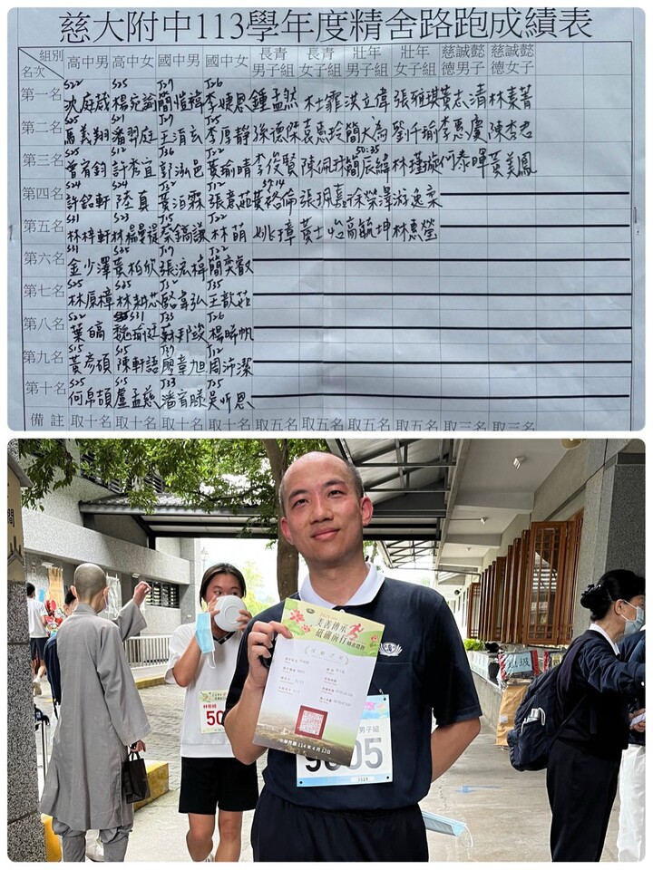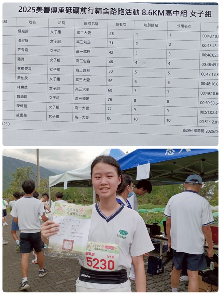 今天清晨6點20分嗚槍聲響起後,參加精舍路跑的師生與慈誠懿德們奮力衝出起跑線,全程8.6KM,沿途加油聲不斷。班上的孩子潘羿庭跑出好成績,勇奪高中女子組第2名!羿庭能文能武,不僅功課好,運動成績也很好。班上的慈懿彥慈媽媽和泰暉哥哥也有報名參加路跑,泰暉哥哥獲得慈懿男子組第3名!彥慈媽媽獲得慈懿女子組第5名!精舍路跑,不只鼓舞學生挑戰自我、突破極限,同時展現腿力、毅力與活力,也讓慈濟教育的精神以身體力行的方式,深植在學子心中。