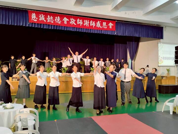 經由兩天八次的排練後,正式上場也只是今天的第二回,承襲著慈濟人一貫的相互依循腳步,會跟也要有慧根的順著跟著,亂中逐漸有秩序地跟著第一橫排,就左右左右整齊莊嚴柔美的腳步完成,敬師禮品也在與老師致贈與熱情擁抱中遞送,留在全校師生的眼裡依舊是一群莊嚴和諧、可親可近的慈誠懿德爸懿德媽身影。