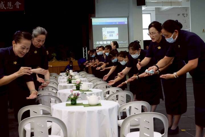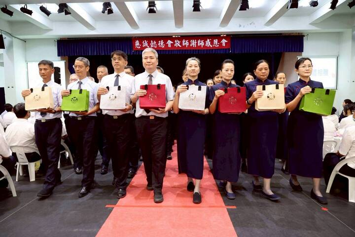 能多留住手機相機鏡頭的是懿德爸媽柔美莊嚴走步,是學生的蹲跪禮敬奉茶,是校長率領老師懿德們學著上人指向天空的那一隻手的初發心,其實最搶鏡頭的就是經由司儀一個一個介紹,主角一個接一個被單手白手套禮賓學生群扶著陪同攜手走星光紅毯出場的夫子老師們。