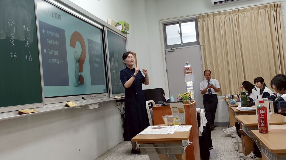 淑美媽媽先從自己的高中及專科是如何選擇上的,在高中及專科學習期間遇到心情低落時又要如何轉換,及遇到學習問題時要如何克服。對於未來,用九月份商業周刊的封面標題:「全台第一份AI 國力報告,為何晶片第一的台灣,輸給新加坡?」來告知孩子們展望未來,我們台灣是海島型國家,以進出口貿易為導向,我們除了要立足台灣,也要展望國際,對於世界各國的經濟及產業變化要放入生活中去時時留心關心,讓自己永遠不被AI 取代,也能與其他國家的人來競爭,最後期許孩子們要積極努力學習!