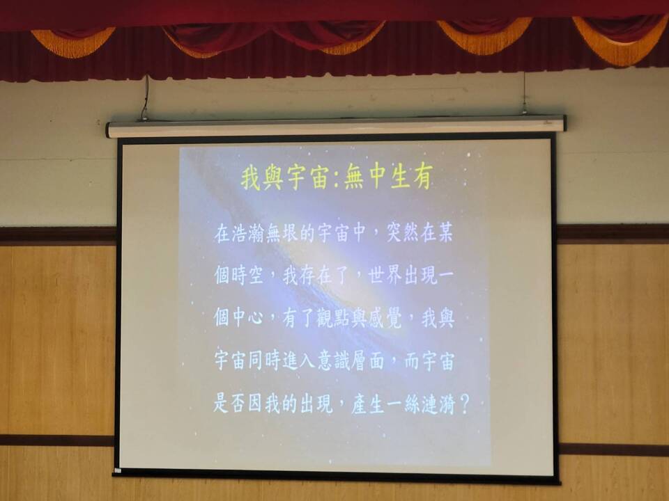 第一個課程由慈濟教育志業王本榮執行長分享『小我、大我到無我慈濟人的生命觀』;我與宇宙:無中生有在浩瀚無垠的宇宙中,突然在某個時空,我存在了,世界出現一個中心,有了觀點與感覺,我與宇宙同時進入意識層面,而宇宙是否因我的出現,產生一絲漣漪?我與宇宙:偶然交會 我是天空的一片雲,偶而投影在你的波心,在轉瞬間消滅了蹤影。你記得也好,最好你忘掉,在那交會時互換的光亮。~徐志摩《偶然》;宇宙時空的過客,來得莫名其妙、活得莫可奈何、走得莫知所終,原始佛法:人無我 法無我 痛苦的源頭是「我」,將色、受、想、行、識五蘊視之為「我」的誤解。五蘊組合我是空的,但沒有論及五蘊是否是空的。