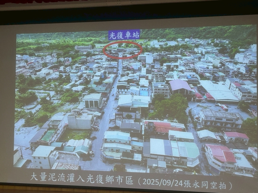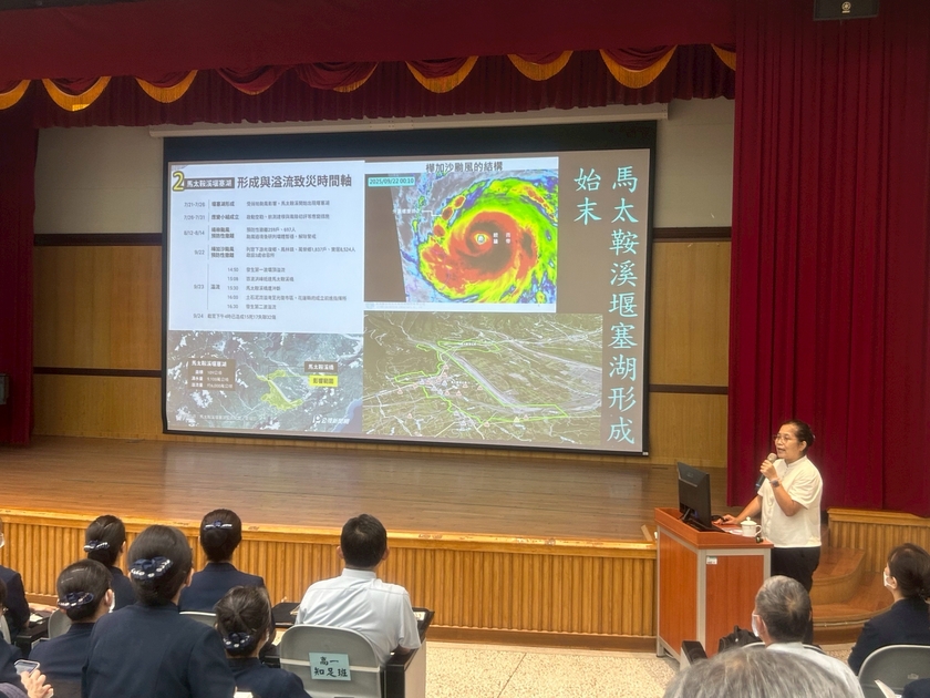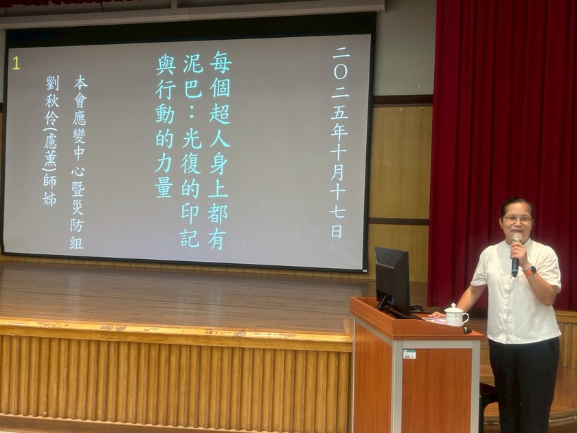 緊接著是本會應變中心暨災防組劉秋伶組長的「樺加沙風災關懷分享」。她從從馬太鞍溪堰塞湖的形成始末說起,透過簡報和短影音,讓大家看到光復災後的現場的怵目驚心。