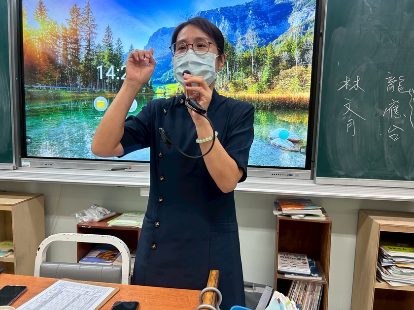 國二大愛班帶動團康,莊惠秀媽媽帶大家玩〈手指謠〉遊戲,很快就讓會場中充滿愉快的笑聲,個個集中注意力聽她的帶動。